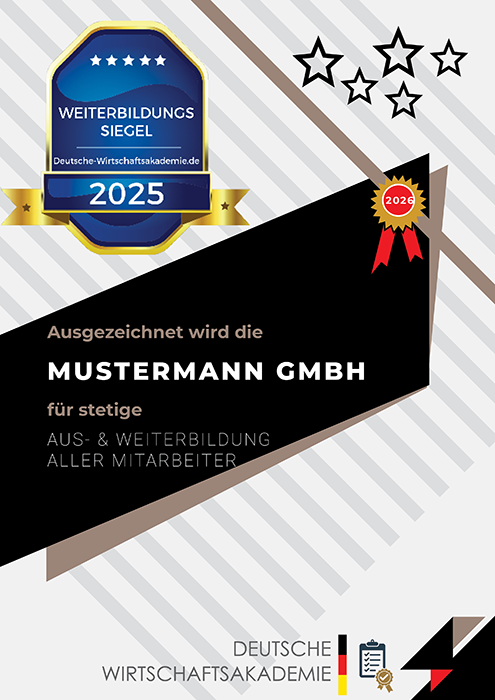 Die Seminarflatrate gilt für sämtliche Mitarbeiter Ihres Unternehmens während der 12-monatigen Laufzeit des Siegels, Der Betrag für das Marketing-Paket fällt einmalig, netto für die 12-monatige Nutzung aller Siegel und der Urkunde an.